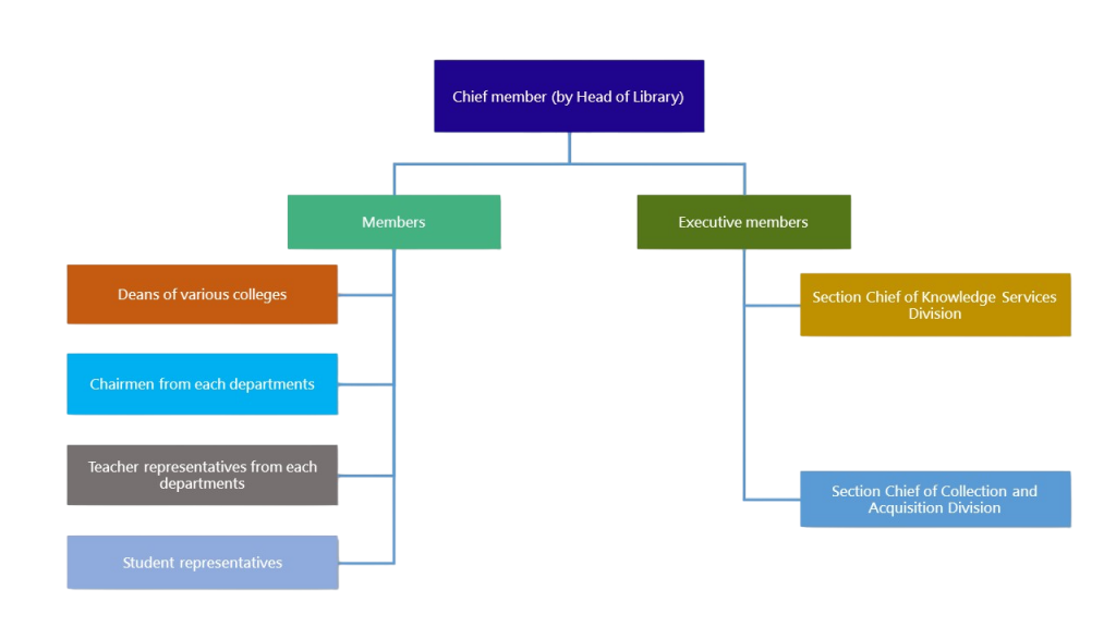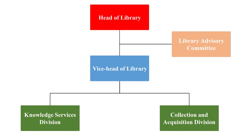 According to rules regulated under Ministry of Education, Head of Library is in charge of managing library programs. Chairmen, teacher representatives, and student representatives participate in Library Advisory Committee to assist planning the affairs of development aspects, discuss library major arrangements, examine regulations and policies, and distribute budgets. Organization structure under Head of Library includes Knowledge Services Division, and Collection & Acquisition Division.